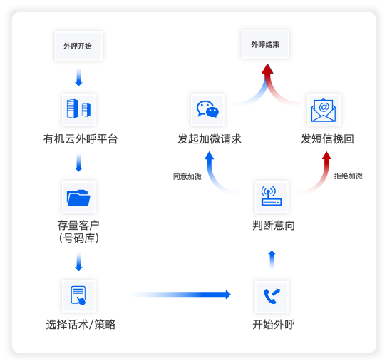 AI外呼机器人会根据与粉丝的对话,智能判断粉丝加微意愿并打上标签,有意愿的粉丝将立即启动自动加粉,无意愿、未接通的粉丝可以启动短信触达进行挽回。