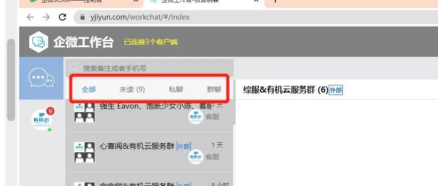 聊天增强页面新增聊天类型分类,含全部、未读、私聊、群聊,有效提高回复效率,避免出现重要聊天被刷,忘记回复等工作失误。