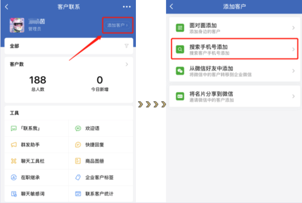(5)通过手机号添加微信:使用场景:适用于CRM中已有客户的手机号,但微信上没有添该客户的场景。