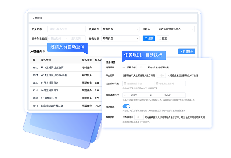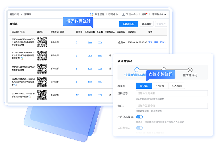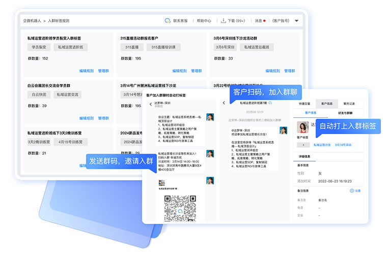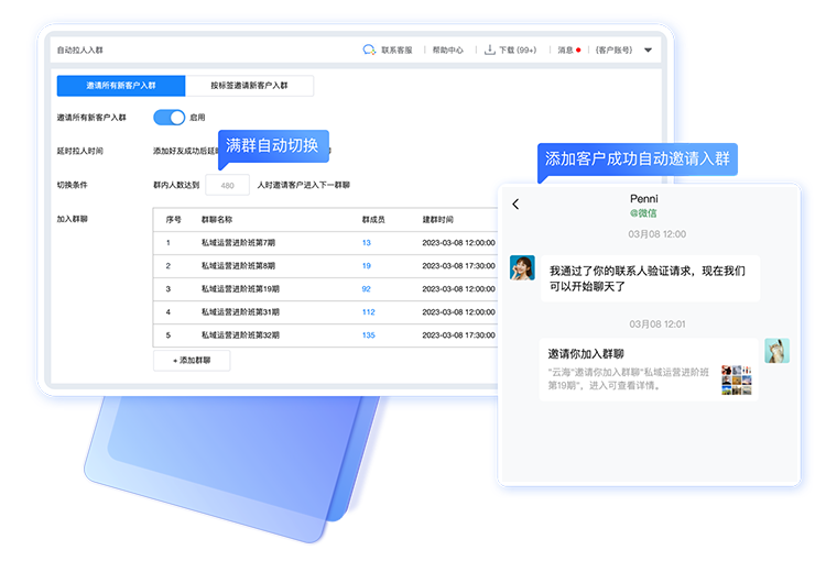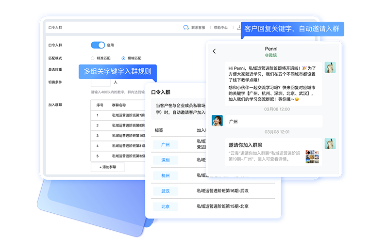 表单建群、批量邀请入群、自动邀请新客户入群等自动化功能,快速建立社群