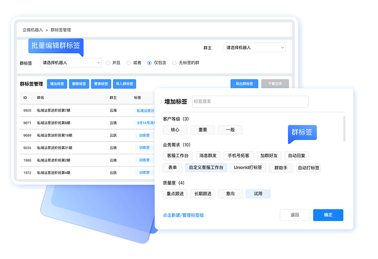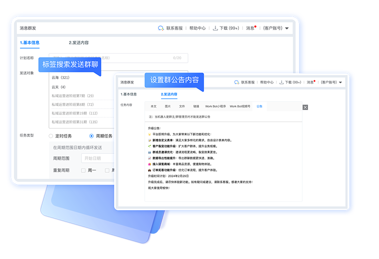 群发公告、群发消息、批量改群名、关键字回复、入群欢迎语等功能让社群运营更高效,降低运营成本